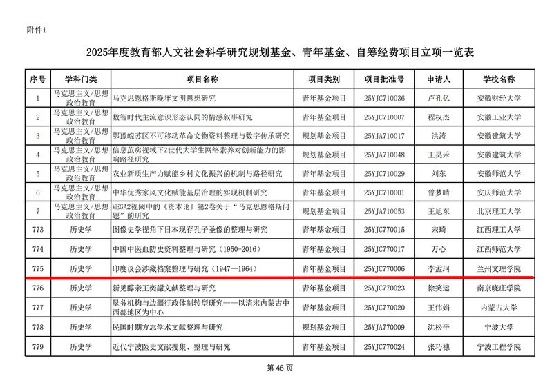近日,教育部社会科学司正式公布2025年度教育部人文社会科学研究项目立项结果(教社科司函〔2025〕16号),beat365文学院李孟珂博士申报的《印度议会涉藏档案整理与研究(1947-1964)》获批立项。