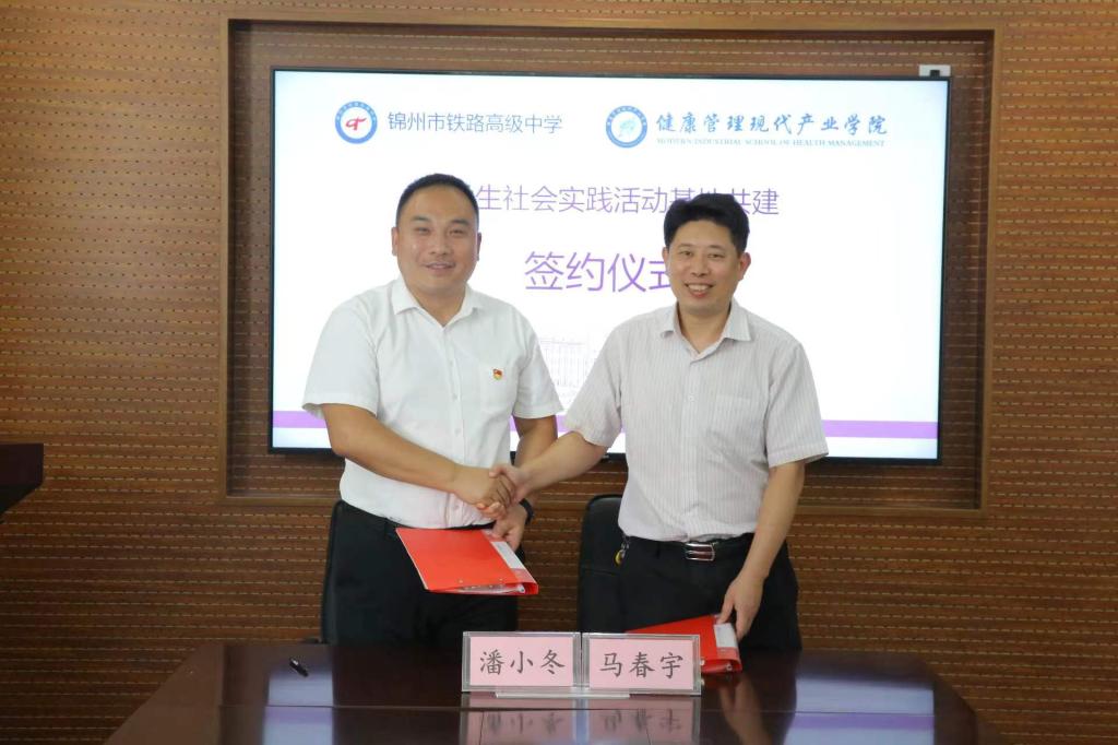 院长马春宇对潘小冬等人一行表示热烈欢迎,学院将充分发挥高校在高等教育、科学研究等方面的优势,在服务社会方面发挥作用,为高中生社会实践提供强有力的智力支持和人才支撑。随后,潘小冬校长介绍铁路高中情况,铁路高中是一所有着七十五载悠久历史的名校,拥有强大的师资力量,秉承“德峻智渊”的校训,以“上善”文化为底蕴。作为2020年辽宁省首批特色高中,铁路高中力求将教育做实,发挥最大的社会作用,让每一名学子都能在这里实现人生理想。此次合作,将对铁中学子生涯规划、实践能力培养等方面起到促进作用。今后铁路高中将积极组织学生到锦医开展实践活动,同时也欢迎健管学院等锦医师生到铁路高中参观指导。双方在亲切热烈的掌声中签订共建协议书。
